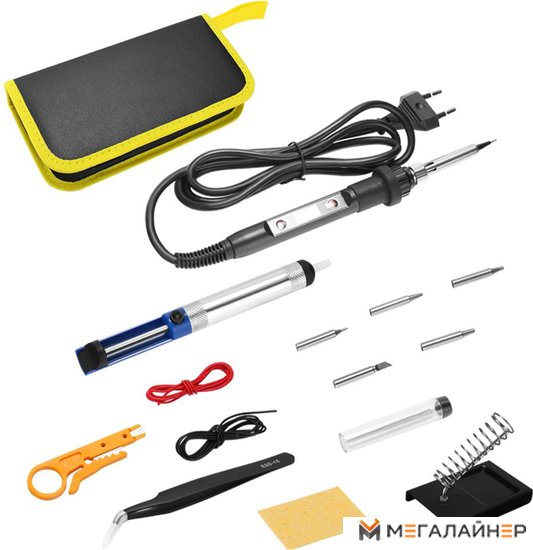 | Комплектация | - Паяльник цифровой 80 Вт, 220 В - Комплект из 5 типов наконечников (конус, игла, клин, скос, ножевидное) - Держатель для паяльника - Губка для очистки паяльного жала - Пинцет - Оловоотсос для припоя - Нож для снятия изоляции - Припой - Провода 2 шт - Пенал на молнии |