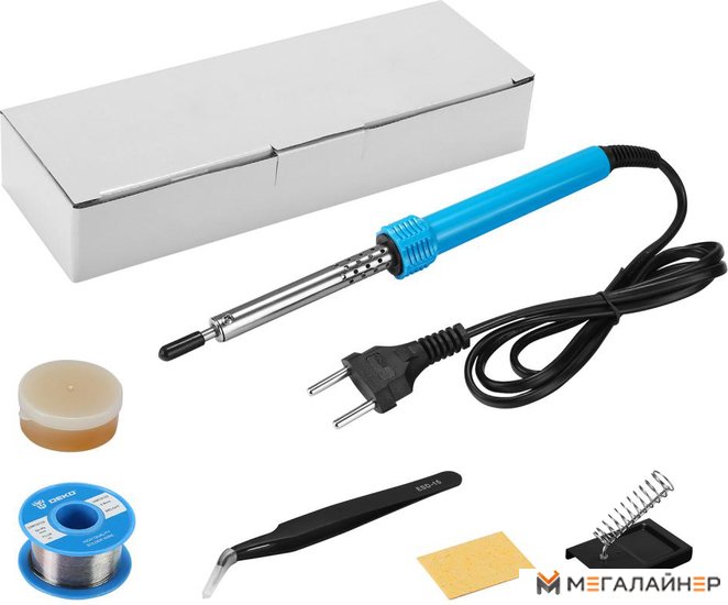 - Паяльник 40 Вт, 220 В; - Подставка для паяльника; - Губка для очистки паяльного жала; - Пинцет; - Припой на катушке; - Канифоль; - Коробка
