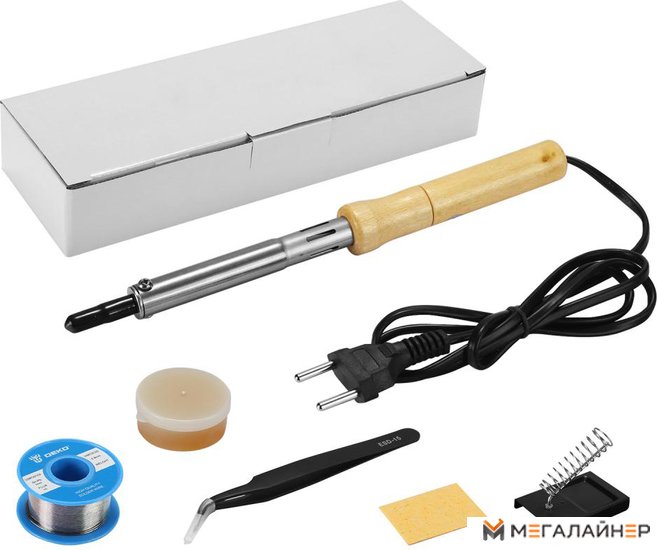 - Паяльник 80 Вт, 220 В; - Подставка для паяльника; - Губка для очистки паяльного жала; - Пинцет; - Припой на катушке; - Канифоль