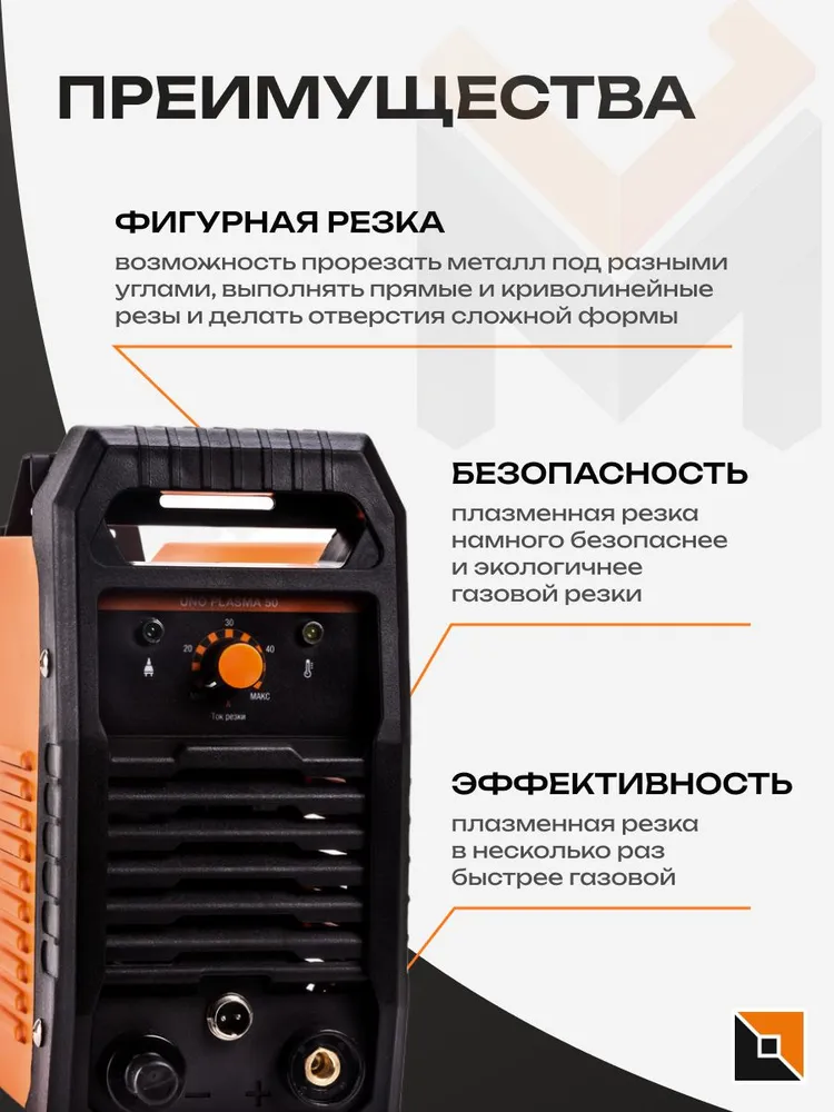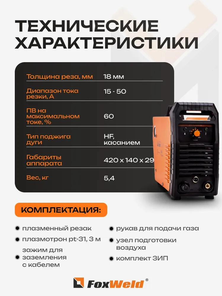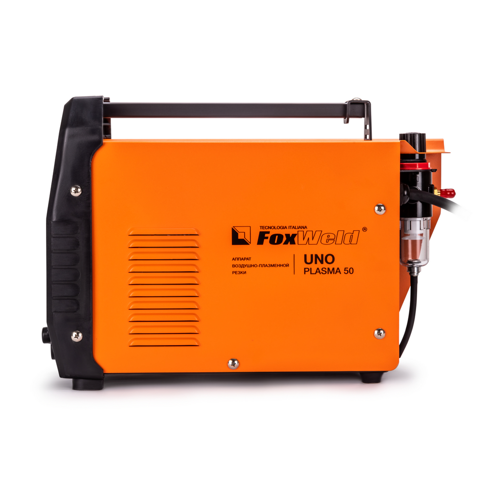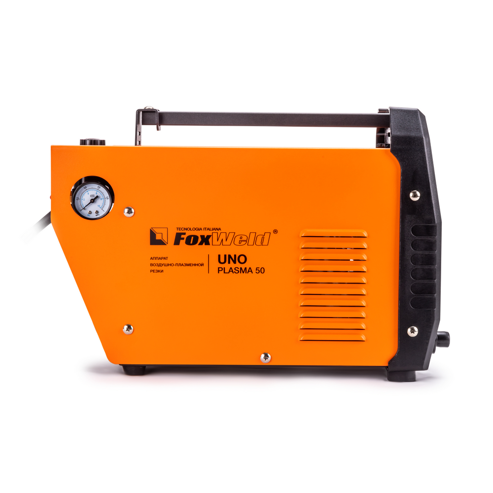 Аппарат плазменной резки FOXWELD UNO PLASMA 50 позволяет разрезать сталь толщиной до 18 мм. UNO PLASMA 50 подходит для резки алюминиевых сплавов, меди, цветных металлов, нержавеющей и углеродистой стали. Высокие динамические характеристики дуги, регулировка и точность установки тока, инверторная технология обеспечивают качество реза и экономию энергии. Встроенный манометр позволяет следить за значениями давления сжатого воздуха в процессе работы и при постпродувке плазмотрона. Небольшой вес и размеры аппарата, наличие ручки на корпусе идеально подходят для бытового и полупрофессионального использования.