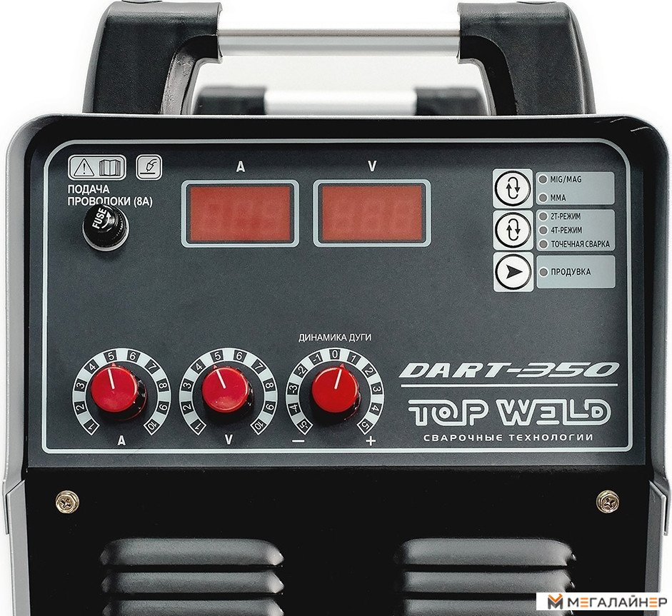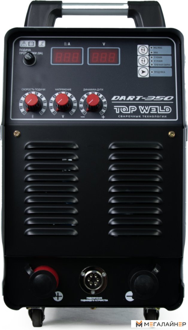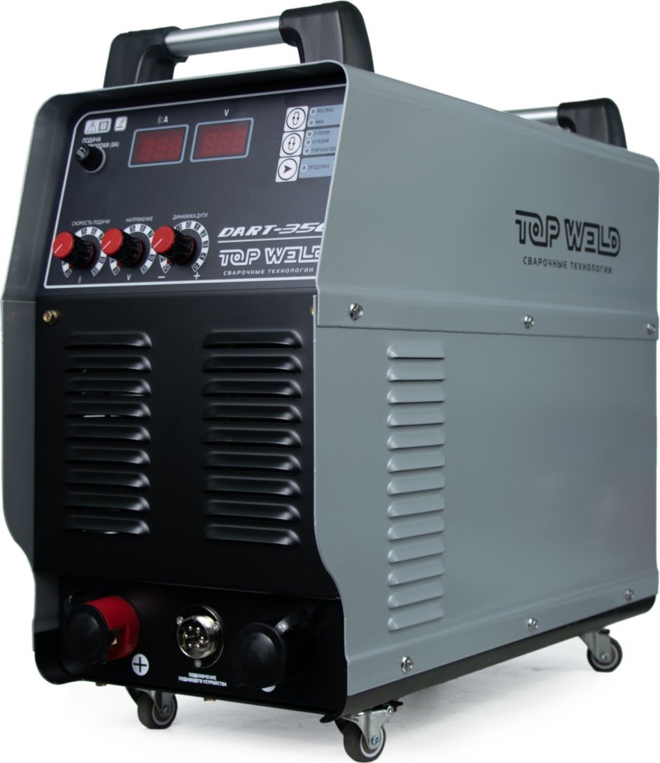 | Информация | - TW DART 350 - это эффективный сварочный инверторный полуавтомат, который применяется для полуавтоматической сварки MIG/MAG в углекислом газе, аргоне или смеси газов и ручной дуговой сварки MMA штучными покрытыми электродами. Данная модель широко применяются для сварки углеродистых, низколегированных, нержавеющих сталей. - Современная инверторная технология на базе IGBT транзисторов заметно увеличивает эффективность сварки и уменьшает затраты энергии. - Сварочный аппарат обладает простой и информативной панелью управления, на которой расположены цифровые индикаторы напряжения и скорости подачи сварочной проволоки. Возможность регулировки сварочного напряжения, индуктивности, скорости подачи проволоки и других параметров сварочного процесса обеспечивает гибкость и точность настройки сварочного аппарата для различных задач и материалов. - Режимы 2Т и 4Т, функции «Прогон проволоки», «Продувка газа», «Точечная сварка» и «Интервальная сварка» обеспечивают высокую эффективность процесса сварки в любых условиях. - Дополнительная функция ручной дуговой сварки MMA позволяет использовать штучные электроды диаметром от 2,0 до 6,0 мм. - Устройство оснащено прочным металлическим корпусом и поворотными колёсами, обеспечивающими удобство перемещения по рабочей площадке. Это гарантирует надёжность и мобильность аппарата. - Полуавтомат TW DART 350 работает от сети 380 В и имеет максимальный сварочный ток 350 А (ПН 60%). Он потребляет максимальную мощность 16 кВт и может использовать сварочную проволоку диаметром от 0,8 до 1,2 мм. Вес аппарата составляет 37,5 кг, а гарантийный срок — 12 месяцев. - |