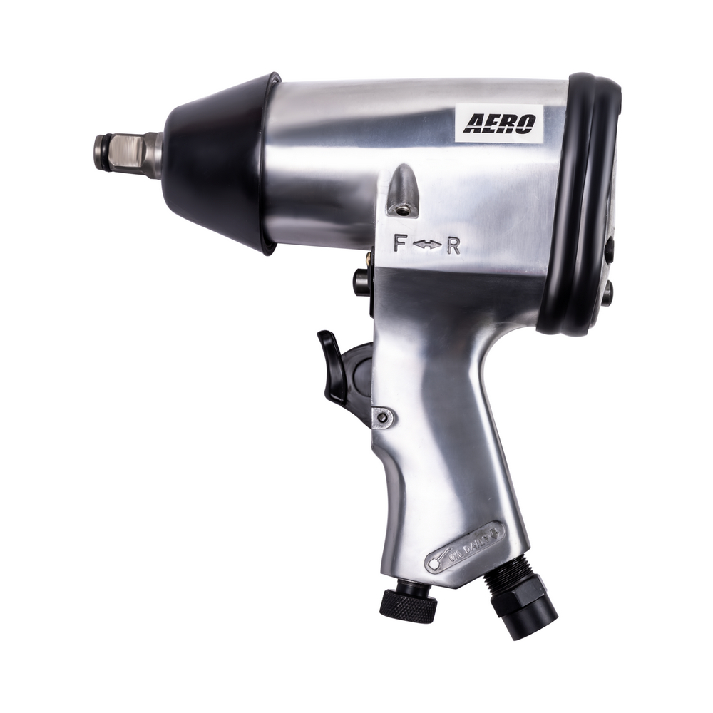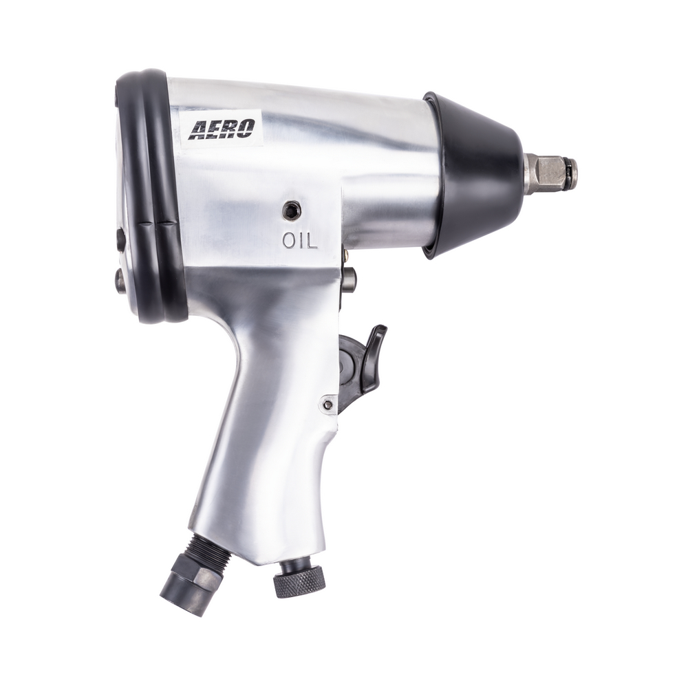Пневматический ударный гайковёрт AERO с крутящим моментом в 310 Нм предназначен для работы с резьбовыми соединениями. Ударно-вращательное действие гайковерта используются для закручивания или откручивания крепежных деталей. Для этого изделие оснащено переключателем для реверса. Применение гайковёрта в быту или в профессиональной сфере позволяет не только сэкономить время и силы, но и значительно повышает долговечность элементов резьбовых соединений, а значит, и общее качество сборки механизма. Корпус гайковёрта изготовлен из легкого алюминиевого сплава, а приводной квадрат с фрикционным кольцом размером 1/2" изготовлен из очень прочной стали, легированной хромом, молибденом и никелем. Отток воздуха осуществляется вниз через рукоятку пистолета. Имеет короткую ось. Может применяться в автосервисе для легкой работы или на сборочных производствах, также прекрасно подойдет в качестве профессионального инструмента для гаража.