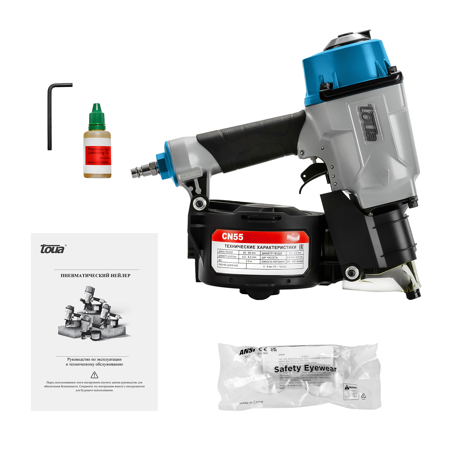 Toua CN55 гвоздезабивной пневматический пистолет барабанного типа работает с гладкими, ершеными и винтовыми гвоздями соединенными между собой проволокой. Обладает высокой производительностью, большим ресурсом и низкой стоимостью точки крепления. Подходит для работ на производстве и конвейерной сборки.