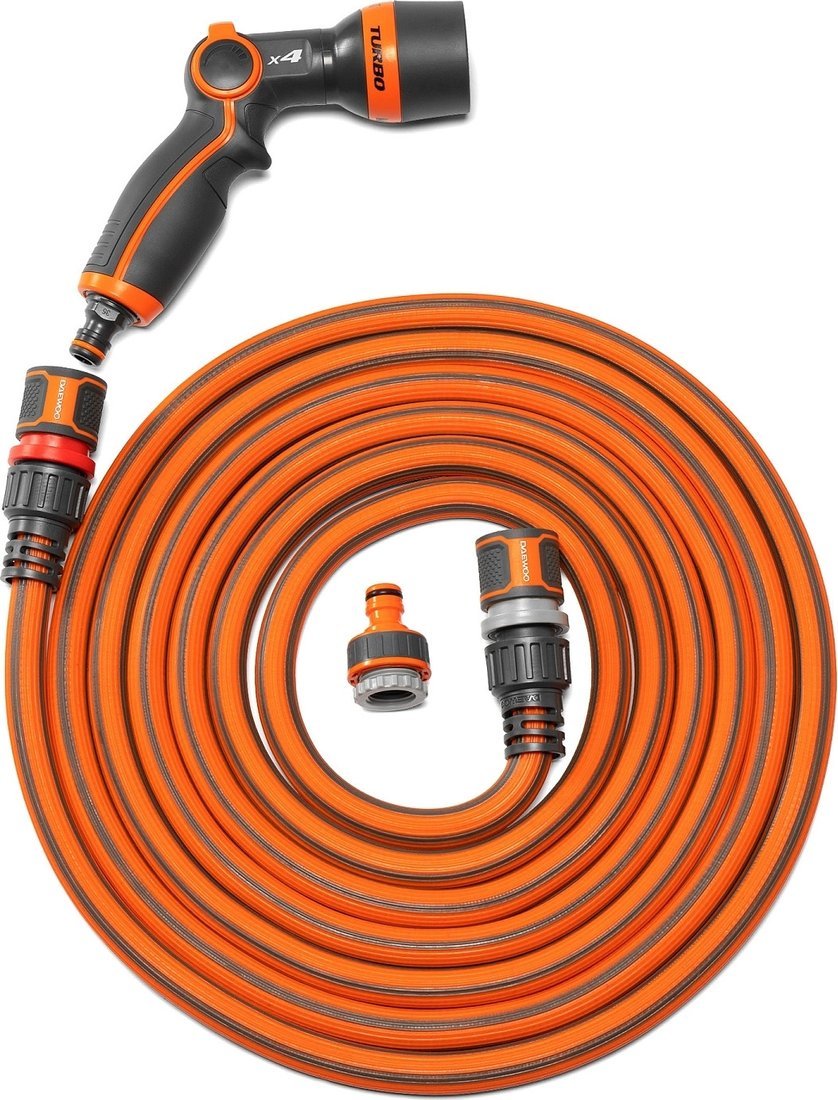 | Информация | - Увеличение длины до 3 раз Благодаря гофрированному внутреннему слою из гибридного полимера под воздействием давления воды шланг увеличивает длину до 3х раз. - Прочный верхний слой Тактильно приятный внешний слой из искусственного каучука защищает шланг от воздействия окружающей среды и позволяет ему легко скользить по любой поверхности. - Безопасный Материалы, из которых изготовлен шланг, не содержат токсичных фталатов и тяжелых металлов. - Полный комплект В комплекте поставки всё, что нужно для моментального подключения к водоснабжению. Шланг имеет быстросъёмные коннекторы, один из которых имеет запорный клапан Aquastop и 4-режимный пистолет DWG 1020 для решения любых задач в саду, а также адаптер для крана DWC 1019. |