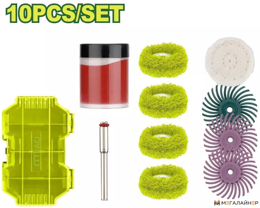 - Полировальная паста - 1 шт.; - Абразивный диск - 4 шт.; - Полировальный диск - 1 шт.; - Абразивные щетки - 3 шт.; - Хвостовик 1/8" - 1 шт.; - Кейс