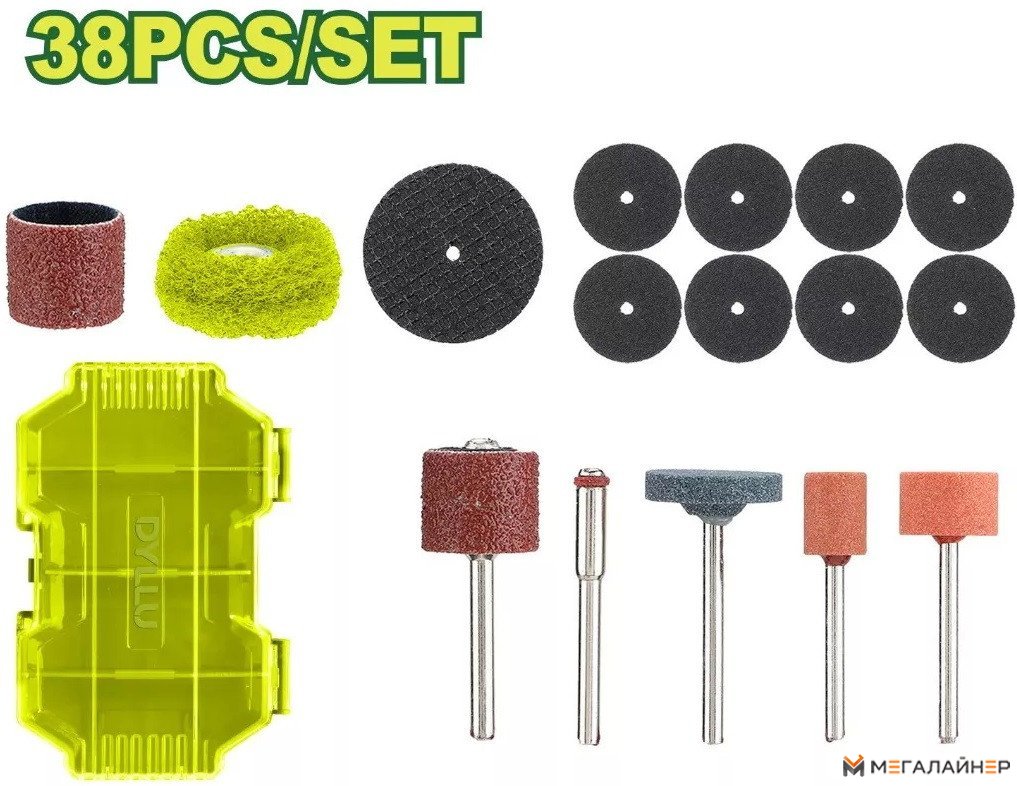- Отрезной круг - 1 шт.; - Абразивный полировальный круг - 1 шт.; - Шлифовальная лента - 6 шт.; - Шлифовальный камень - 3 шт.; - Шлифовальный диск - 25 шт.; - Шлифовальный барабан с оправкой - 1 шт.; - Хвостовик 1/8" - 1 шт.; -