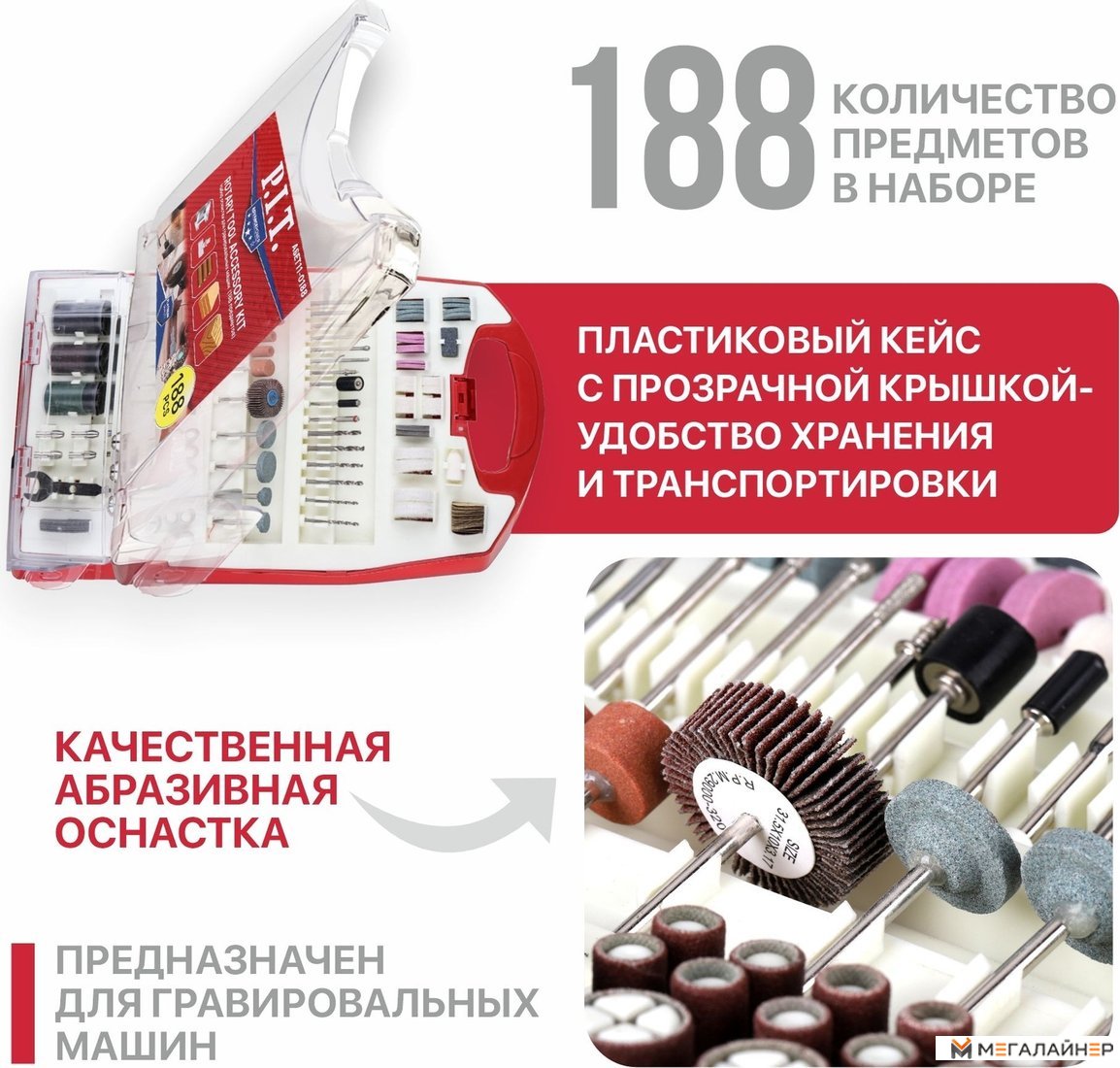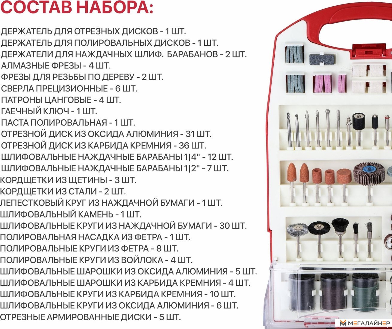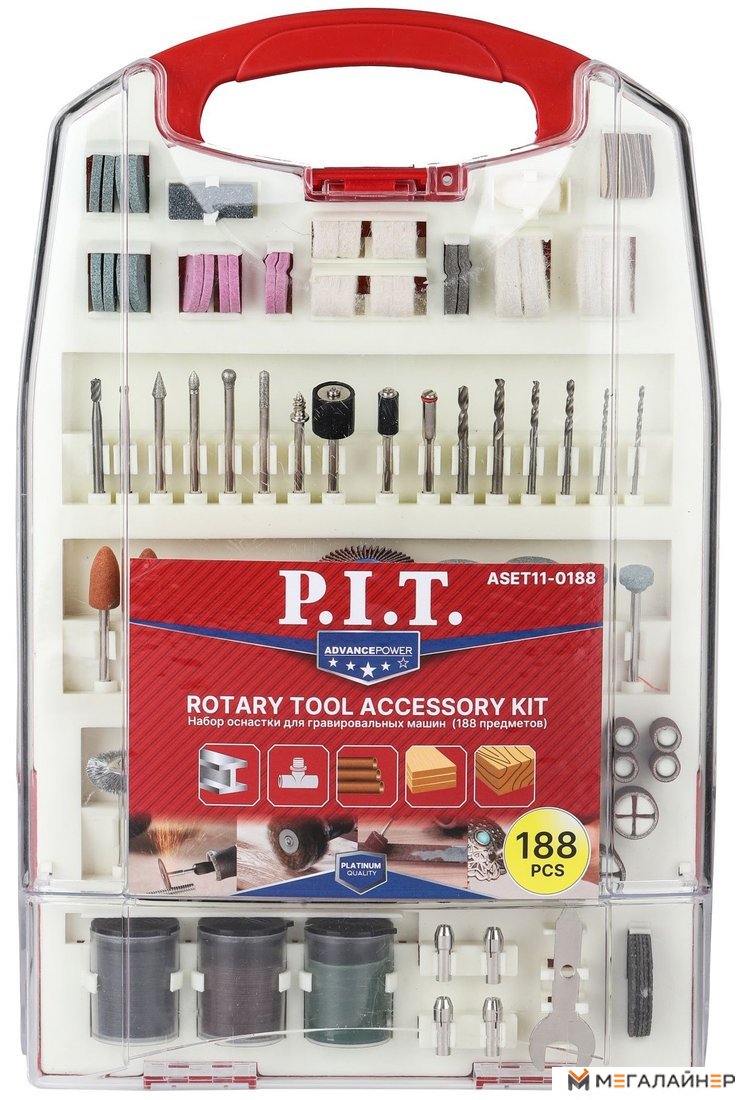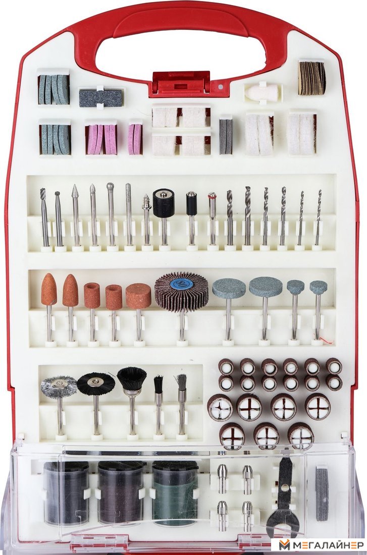 | Комплектация | Набор принадлежностей для гравировальных машин 188 предметов, пластиковый кейс |