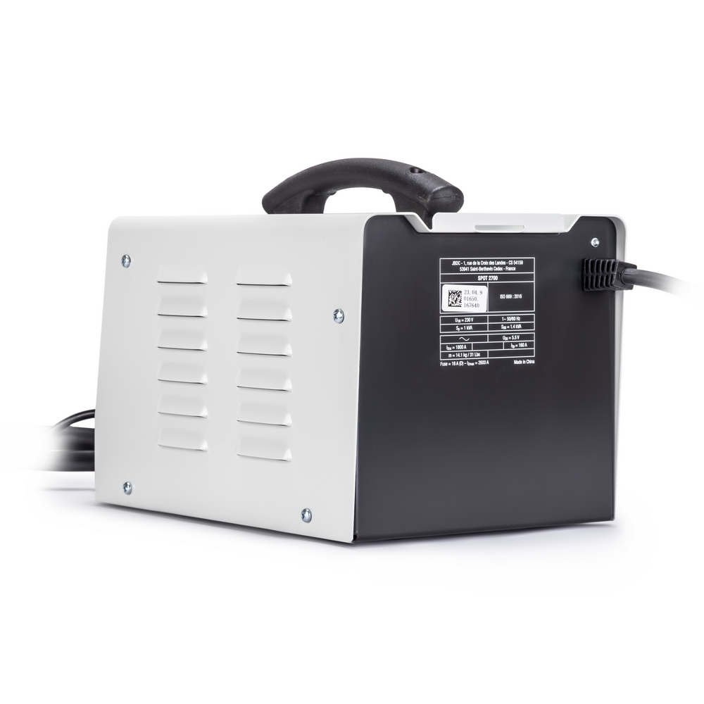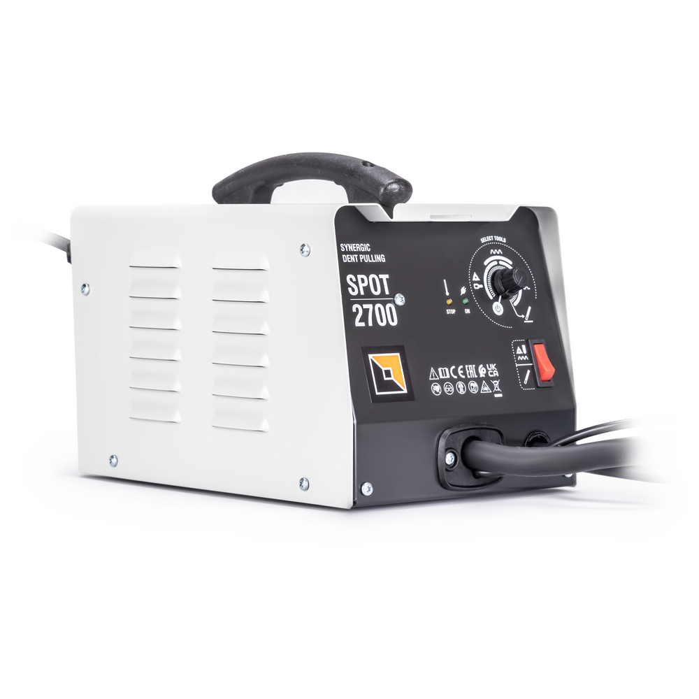 Споттер FoxWeld SPOT 2700 – аппарат для точечной контактной сварки, который применяется при восстановлении геометрии кузовных панелей автотранспортных средств, а также при ремонте стальных тонкостенных элементов. Данный аппарат предназначен для осуществления следующих кузовных работ: рихтование; сварка гвоздиков, заклёпок, кружков и шпилек для накладок; удаление выемок; выравнивание поверхности, устранение вмятин. Аппарат не предназначен для сборки металлических деталей. В качестве источника питания используется бытовая сеть переменного тока 230 В. Использование меди для обмотки силовой катушки трансформатора позволило увеличить силу тока сварки до 2600 А. Этот фактор в сочетании с сетевым предохранителем, увеличивает надежность агрегата.