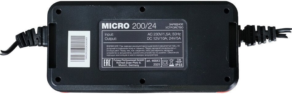 | Информация | FUBAG MICRO 200/24 представляет собой интеллектуальное зарядное устройство для обслуживания аккумуляторов напряжением 12 и 24 В с емкостью от 25 до 320 А·ч и до 150 А·ч соответственно. Зарядное устройство также поддерживает литиевые аккумуляторы 12 В, включая LiFePO4. Используется 8-ступенчатая автоматизированная программа зарядки с функцией тестирования состояния аккумулятора перед зарядкой, импульсным основным режимом и восстановлением сульфатированных батарей. ЖК-дисплей показывает информацию о текущем режиме работы и состоянии аккумулятора, обеспечивая пользователю прозрачность процесса. Корпус соответствует стандарту IP33, что обеспечивает защиту от влаги и пыли. Устройство оснащено электронными системами защиты от коротких замыканий, перегрузок и неправильного подключения. Благодаря компактным габаритам и небольшому весу устройство удобно для эксплуатации и транспортировки. В комплект входит необходимое подключающее оборудование — кабели и зажимы, что позволяет использовать MICRO 200/24 во многих типах транспорта: легковых и грузовых автомобилях, автобусах, яхтах, мотоциклах и прочей технике. Преимущества зарядного устройства FUBAG MICRO 200/24: Работа с аккумуляторами напряжением 12 В и 24 В. Поддержка свинцово-кислотных и литиевых аккумуляторов (включая LiFePO4). Широкий диапазон емкости: 12 В - от 25 до 320 А·ч, 24 В - до 150 А·ч. 8-ступенчатая автоматизированная программа зарядки. Функция тестирования состояния аккумулятора перед зарядкой. Режим восстановления сульфатированных батарей. Информативный ЖК-дисплей для контроля процесса. Защита от коротких замыканий, перегрузок и неправильного подключения. Степень защиты корпуса IP33 (от влаги и пыли). Компактные габариты и небольшой вес. Полная комплектация кабелями и зажимами. Читать дальше |