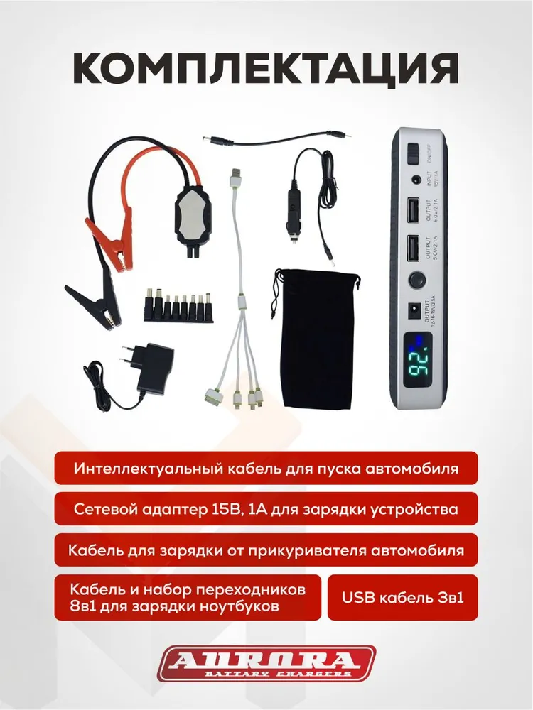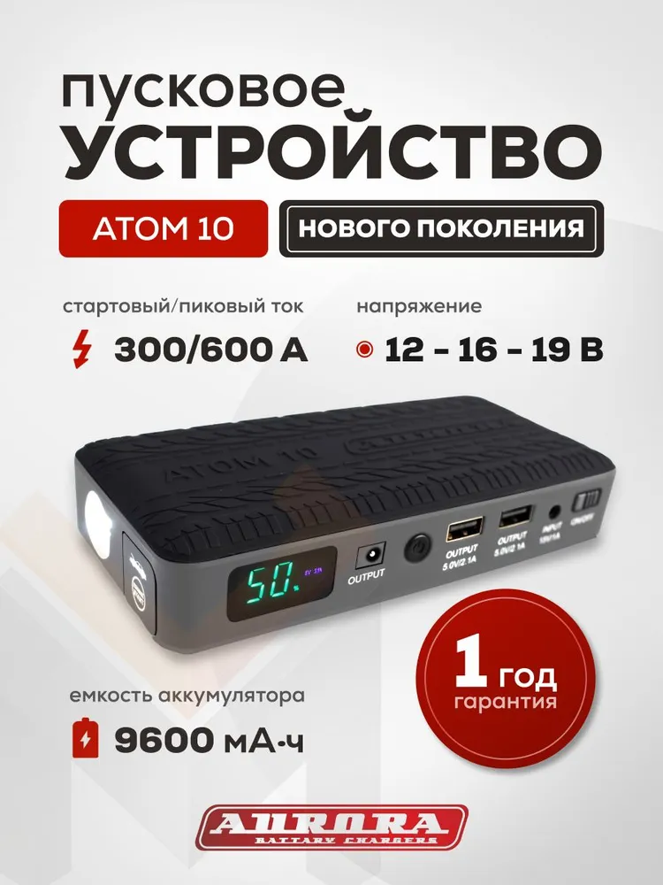 AURORA ATOM 10 – мобильное пусковое устройство нового поколения, оснащённое встроенным литий-полимерным аккумулятором LiPo.