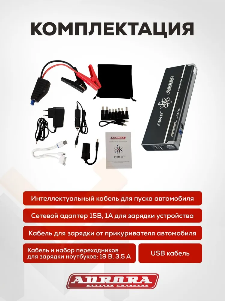 AURORA ATOM 18 EVOLUTION пригодится для запуска легковых автомобилей, мотоциклов, генераторов и других приборов, которые используют 12В аккумуляторы. Аппарат справится с запуском бензиновых (объемом 5-7 л) и дизельных (объемом до 4 л) двигателей. Прибор можно использовать для зарядки или питания различных мобильных гаджетов и портативных устройств, таких как телефоны, ноутбуки, планшеты и автохолодильники. Для удобства работы в плохо освещенных местах есть LED-фонарь, который обеспечит отличный обзор места работы. Фонарь имеет несколько режимов работы. Один из которых "SOS" (мигание фонаря). С его помощью вы можете подать сигнал для предупреждения других участников дорожного движения при неисправных световых приборах автомобиля.