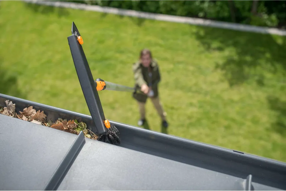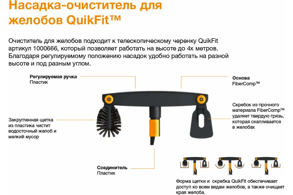 Очиститель для желобов подходит к телескопическому черенку QuikFit, который позволяет работать на высоте до 4х метров. Благодаря регулируемому положению насадок удобно работать на разной высоте и под разным углом.
