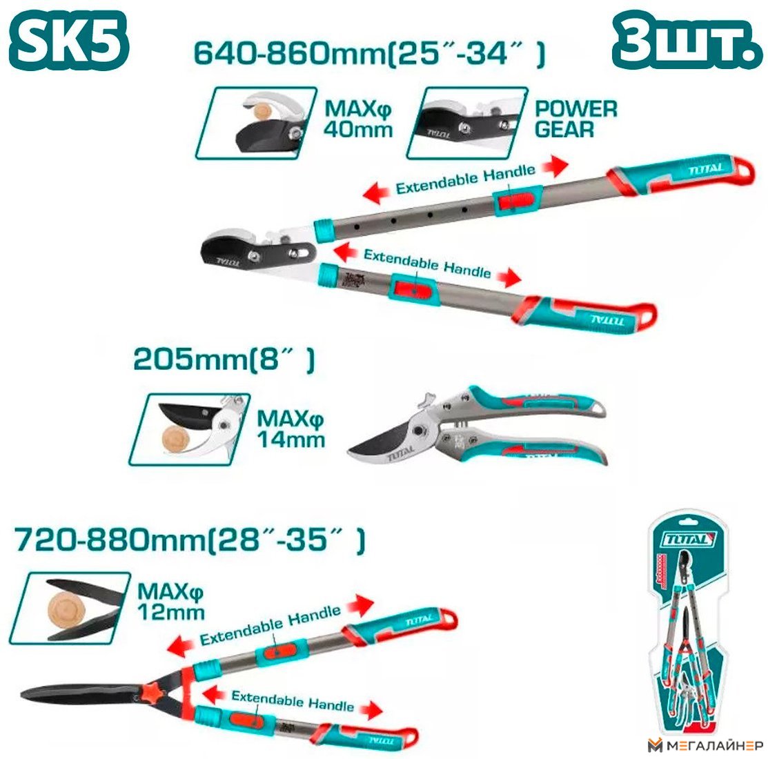 | Комплектация | - Секатор 205 мм (THT15308) - 1 шт. - Сучкорез 640-860 мм (THTS1527416) - 1 шт. - Ножницы для кустов 720-880 мм (THTS1516306) - 1 шт. - Блистер |