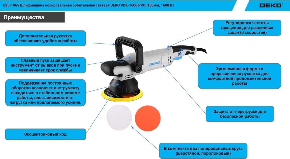 | Информация | - Полировальная машина Deko PDK-1600 PRO — это идеальный инструмент для шлифования и полирования различных покрытий, включая лакокрасочные и полимерные материалы. Благодаря своей мощности, она обеспечивает высокое качество обработки. - Удобство в работе достигается благодаря дополнительной рукоятке, которая позволяет надежно удерживать инструмент и контролировать процесс. Это особенно важно при выполнении сложных задач, требующих точности и аккуратности. - Крепление оснастки на липучку делает замену абразивных материалов быстрой и простой. Вы сможете легко адаптировать машину под различные задачи, что значительно увеличивает ее функциональность. - Обратите внимание на надежность и долговечность Deko PDK-1600 PRO, что делает ее отличным выбором для профессионалов и любителей. Этот инструмент станет незаменимым помощником в вашем арсенале для достижения идеальных результатов в полировке и шлифовке. |