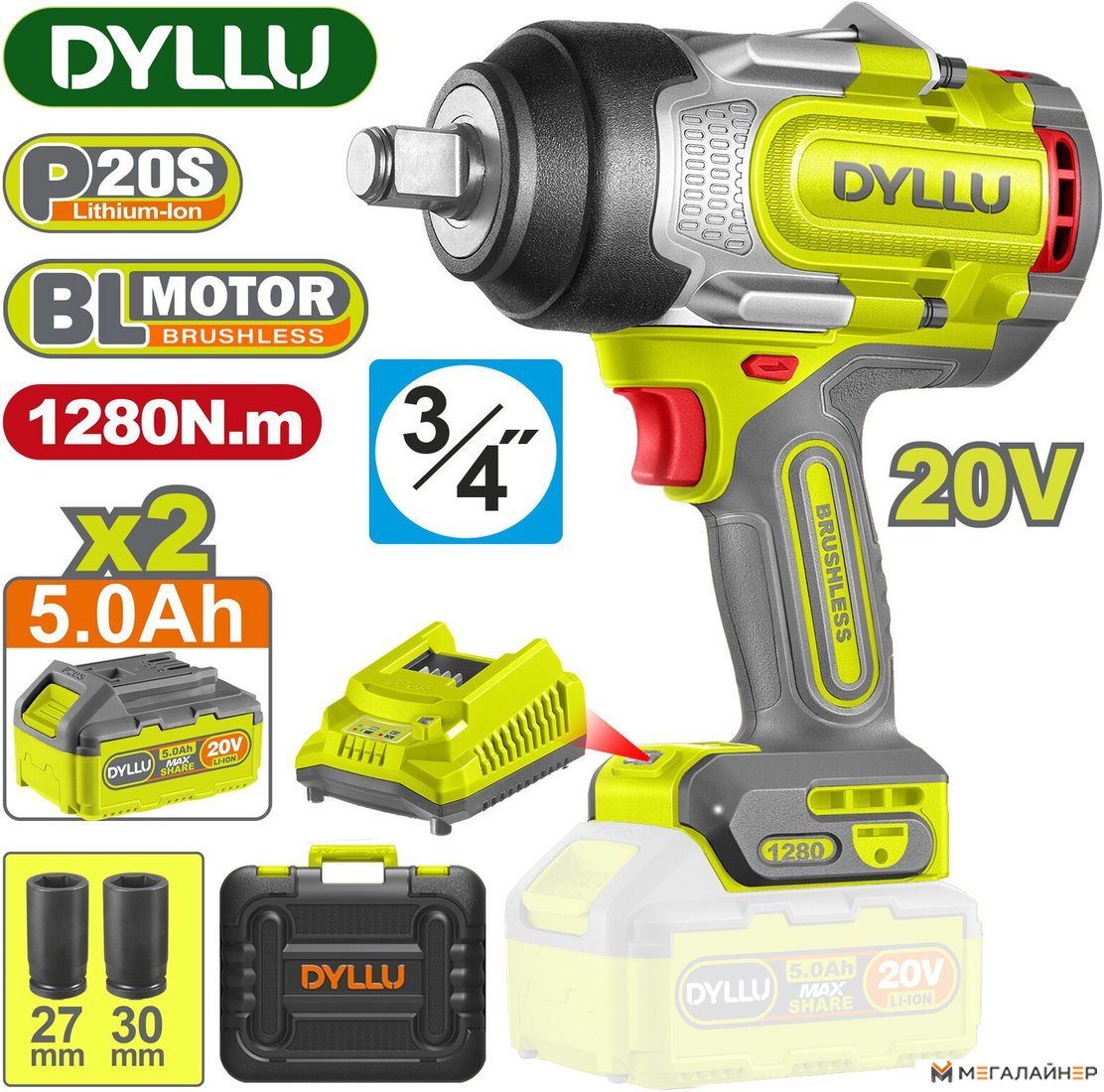 | Комплектация | - Гайковерт - 1 шт. - Аккумулятор DTLBP550 5,0 Ач - 2 шт. - Зарядное устройство DTFCP518 - 1 шт. - Торцевая головка 27, 30 мм - 2 шт. - Инструкция - Кейс |