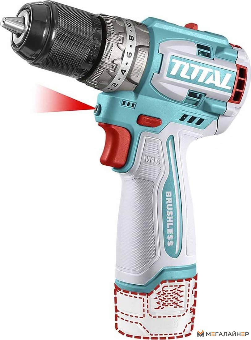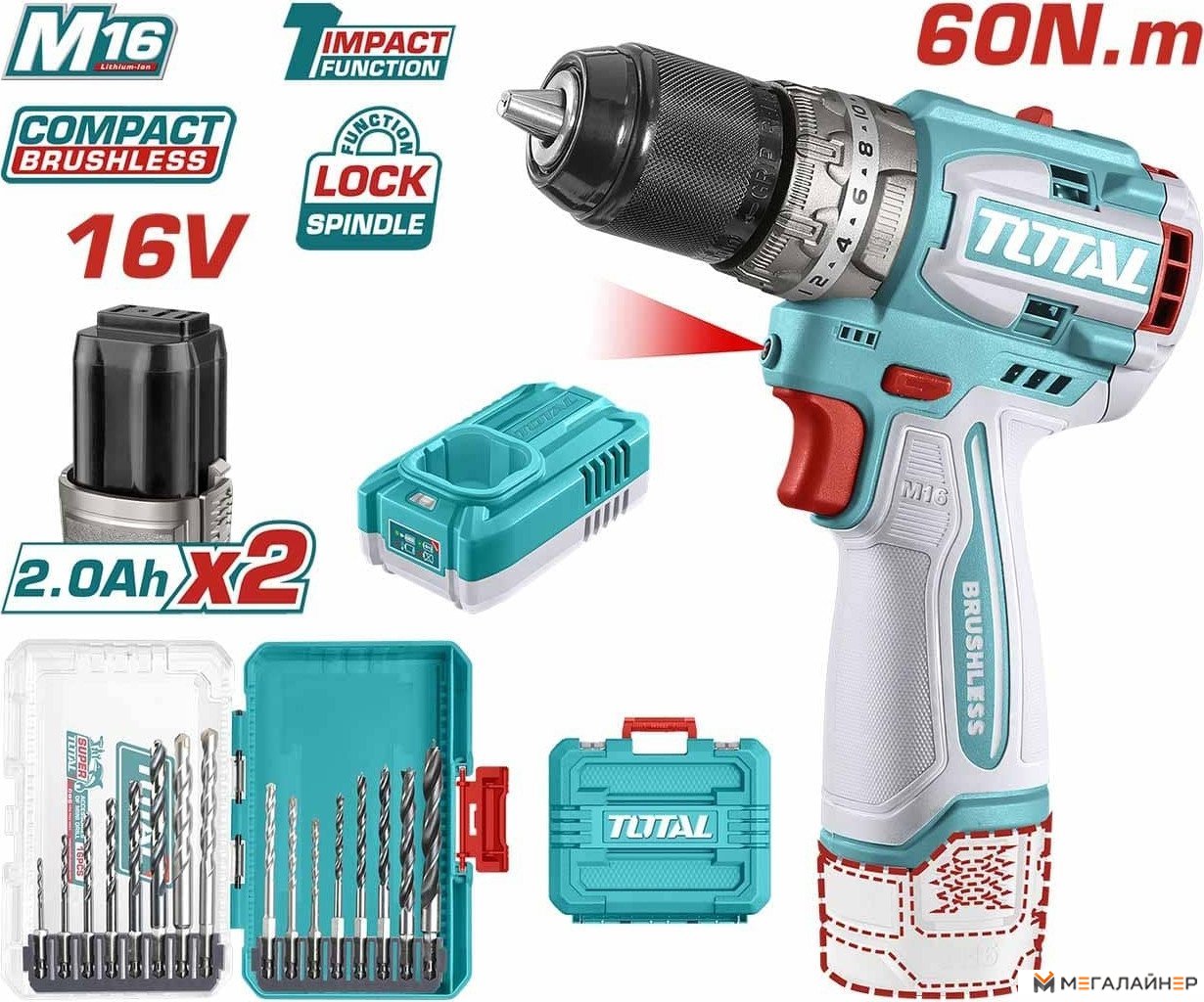 - Бесщеточная дрель-шуруповерт - 1 шт.; - Аккумулятор 2,0 Ач TFBLI1620 - 2 шт.; - Зарядное устройство 1,3 А TFCLI1613 - 1 шт.; - Сверла по металлу, дереву, бетону в кейсе - 16 шт.; - Инструкция; - Кейс