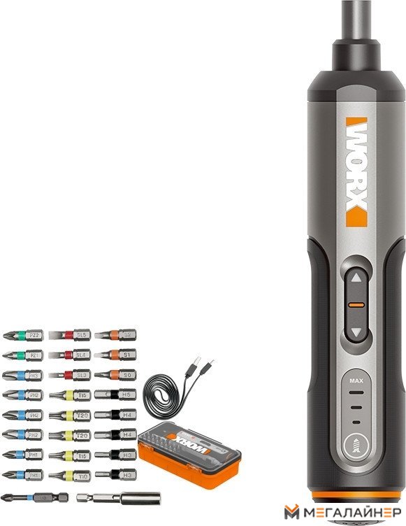 - Аккумуляторная отвертка WX240,; - Набор бит — 26 шт,; - USB — переходник для зарядки,; - Пластиковый пенал для хранения.