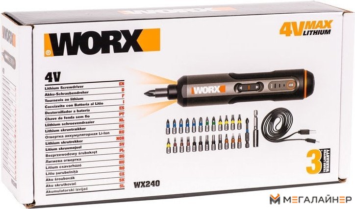 | Комплектация | - Аккумуляторная отвертка WX240, - Набор бит — 26 шт, - USB — переходник для зарядки, - Пластиковый пенал для хранения. |