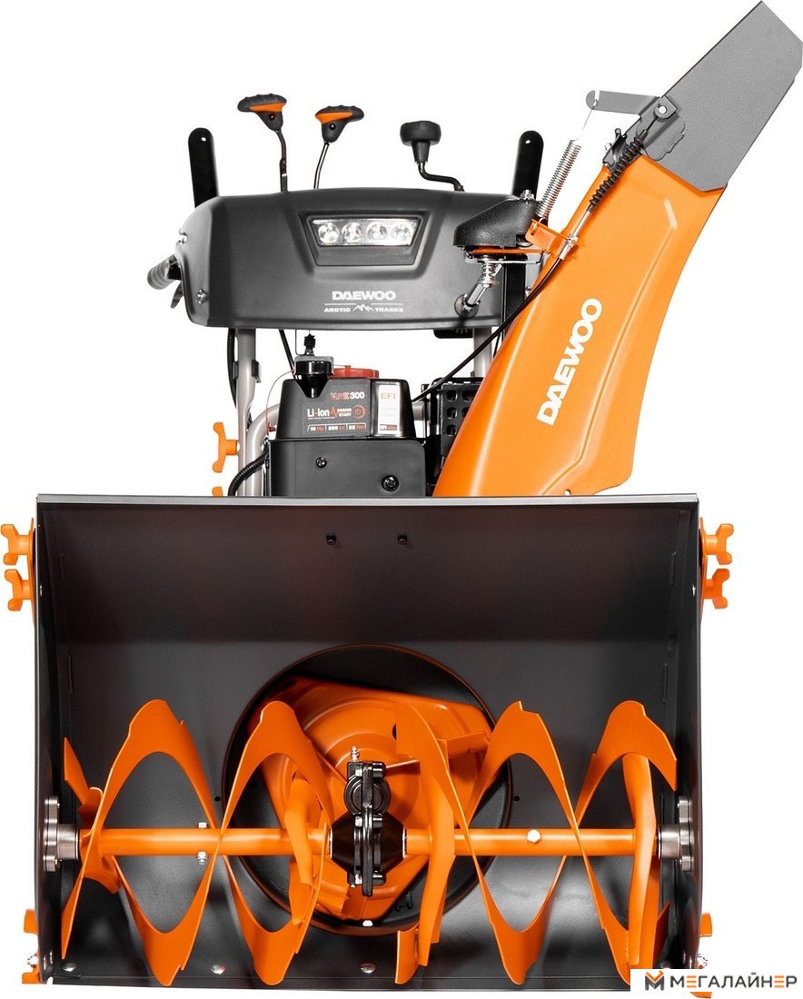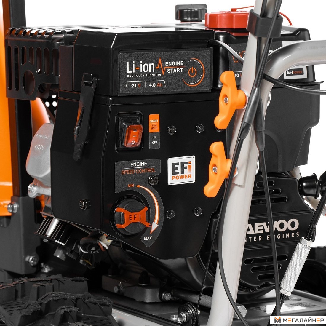 | Информация | WXE 300 EFI инжекторный двигатель DAEWOO Инновационный двигатель WXE 300 EFI с системой непосредственного впрыска топлива разработан специально для снегоуборщиков. Обладает увеличенной до 25% мощностью и сниженным до 20% расходом топлива по сравнению с карбюраторными моделями. EFI (Electronic Fuel Injection) EFI - система электронного впрыска топлива. Обеспечивает подачу необходимого количества топлива в зависимости от нагрузки и температуры, обеспечивая: - увеличение мощности двигателя; - сокращение расхода топлива; - стабильность работы двигателя при изменении нагрузки; - легкий запуск при отрицательных температурах, без регулировок воздушной и топливной заслонок. Электронная регулировка оборотов Позволяет выбрать подходящие для работы обороты двигателя. А система EFI будет их поддерживать во время работы, как круиз контроль на автомобиле, обеспечивая оптимальную мощность и расход топлива. Электрозапуск от аккумулятора 21В Запуск двигателя путем нажатия кнопки Start. Питание от аккумулятора DAEWOO 21В. Легкий запуск в любые морозы и возможность использования аккумулятора с инструментом линейки DAEWOO 21В. Уникальные гусеницы ARCTIC TRACK Гусеница объединяет в себе сразу 2-а решения: - Колесо для повышенной маневренности - Гусеница для исключительной проходимости и работы на склонах. 2Х MODE ARCTIC TRACK 1Х MODE максимальная проходимость в глубоком снегу и в горах. 2Х MODE маневренность и скорость работы колесного снегоуборщика. Гидравлический привод Гидроцилиндр обеспечивает плавное изменение положения гусеницы, нажатием одно рычага, и надежный ее прижим к поверхности без дополнительных усилий. Трансмиссия Disc-o-Matik Система обеспечивает выбор скоростей: 6 скоростей вперед и 2 скорости назад, в зависимости от высоты снежного покрова. Простая и одновременно надежная система перемещения фрикционного диска для изменения скорости. Система облегченного маневрирования DIRECT DRIVE Система облегченного маневрирования включает в себя возможность отключения каждой гусеницы в отдельности и позволяет легко выполнить поворот. Панель управления Панель управления с системой изменения скорости передвижения, направления и дальности выброса снега обеспечивает комфортное управление и работу со снегоуборщиком. Система изменения направления выброса Изменение угла выброса на 200 градусов дает возможность мгновенно изменять направление и дальность выброса снега непосредственно с панели оператора с большим углом поворота. Взаимная блокировка рукояток Нажатие 2-х рукояток управления приводит к их взаимной блокировке. Это позволяет управлять снегоуборщиком одной рукой, и одновременно изменять направление и дальность выброса снега без остановки работы. Подогрев рукояток Для комфортной работы при низких температурах снегоуборщик снабжен подогревом рукояток управления. Кнопка включение и выключение размещена на панели и защищена от попадания снега и влаги. Усиленный редуктор Усиленный редуктор в паре со стальными опорами шнека с подшипниками передает до 95% крутящего момента на рабочие узлы сборки и выброса снега. Выходной вал редуктора крепится на подшипниках большого диаметра, что обеспечивает высокую устойчивость механизмов к вибрации и ударам. LED фара Яркая LED фара обеспечивает освещение рабочей зоны перед снегоуборщиком, помогая работать в темное время суток. Обру
