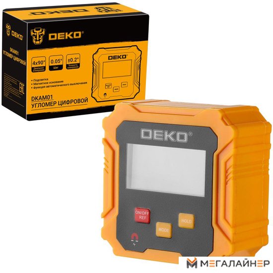 | Информация | Цифровой угломер DEKO DKAM01 предназначен для того, чтобы быстро и точно определить угол отклонения поверхности от горизонтали или вертикали. Характеристики: диапазон измерения 4-90°, шаг измерения 0,05°, магнит, подсветка, питание батарейка 2 ААА |