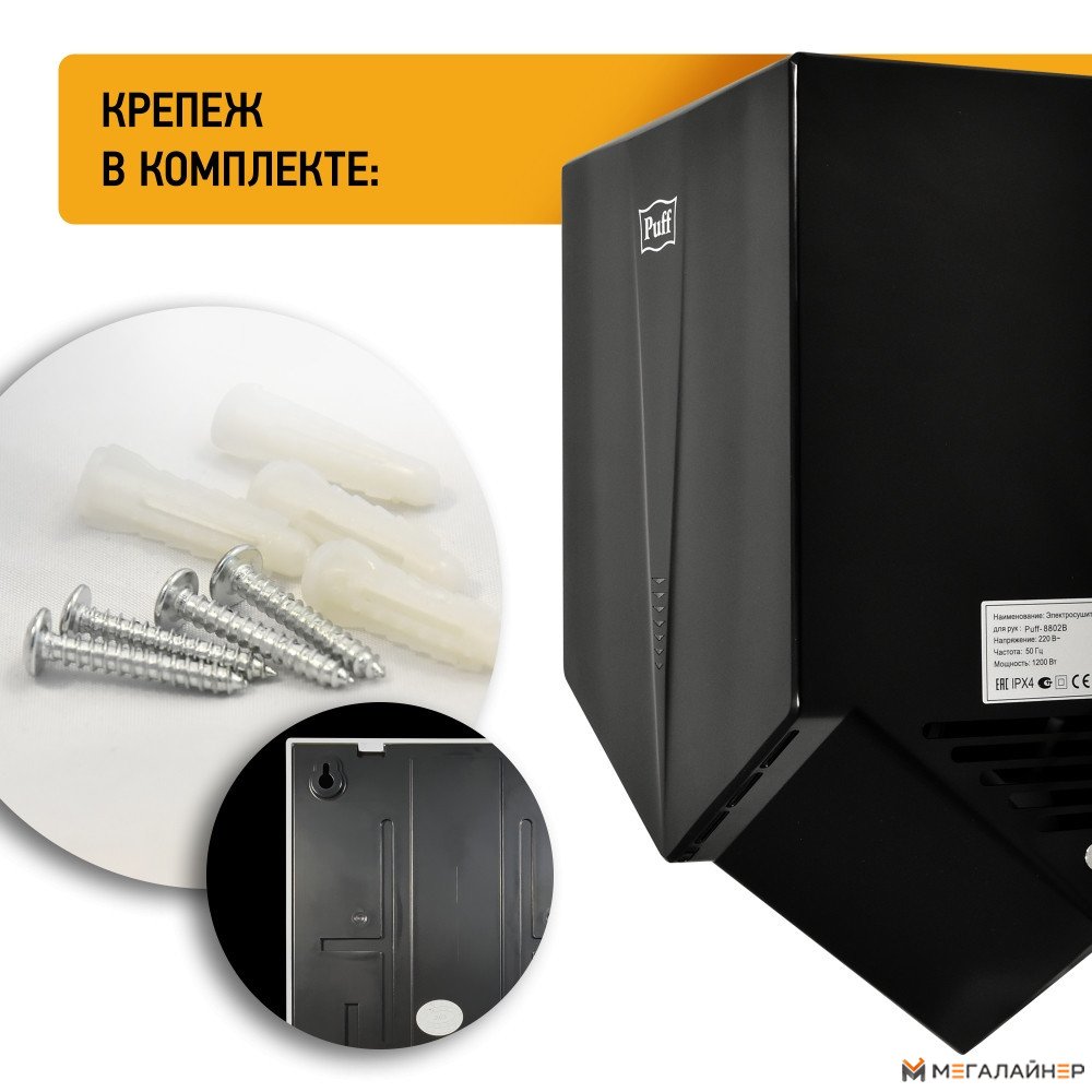 | Информация | - Электросушитель для рук "Puff-8802С" - высокоскоростной, 1,2 кВт. - Материал корпуса: ABC-пластик - Цвет: черный. - Тип: высокоскоростная - Скорость воздушного потока, м/с: 95 - Мощность: 1200 Вт - Время сушки: 5-7 сек - Управление: сенсорное - Область срабатывания сенсора, см: 5-20 - Степень защиты от влаги: IPX4 - Класс энергоэффектипности: A++ - Габариты (мм): 390х235х135 - Вес нетто, кг: 3,37 |