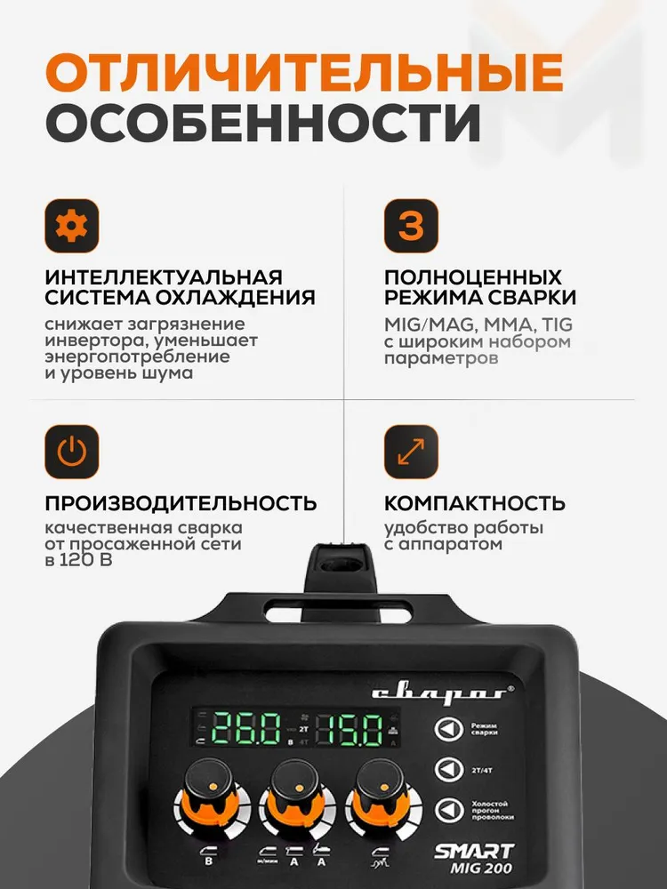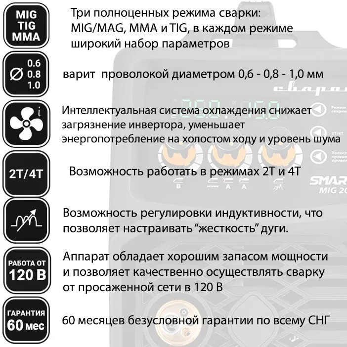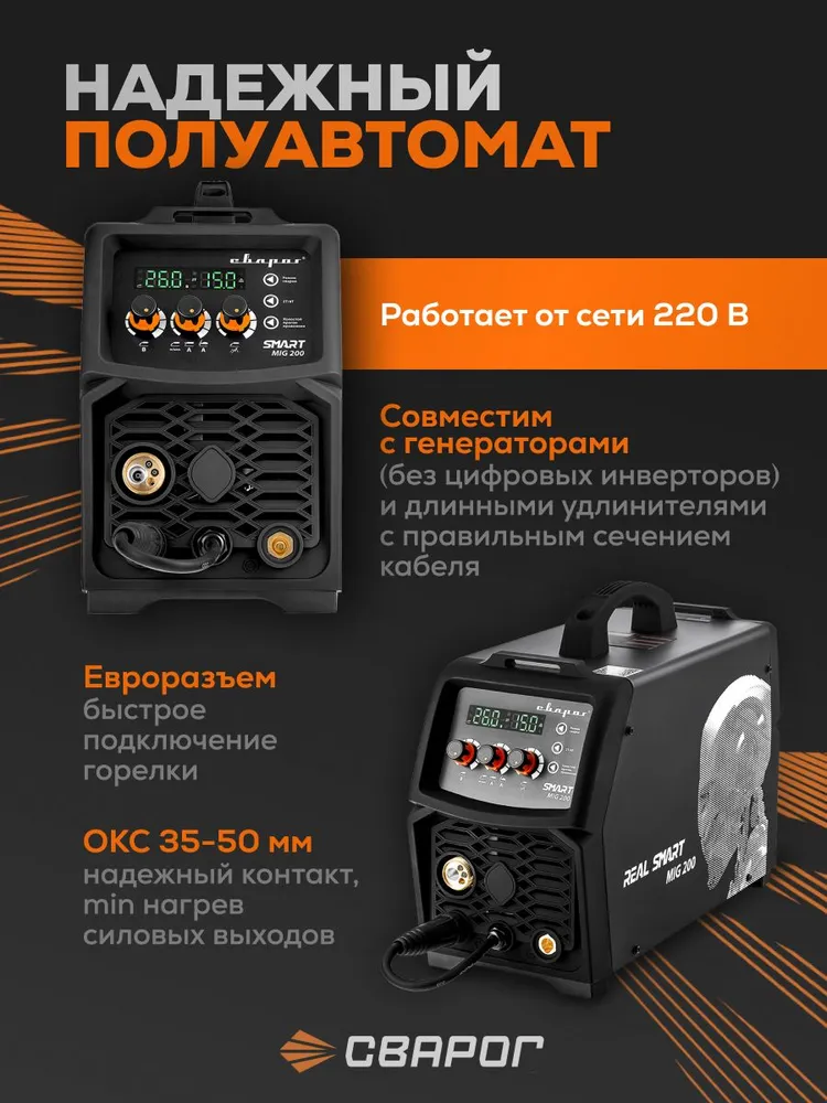 REAL SMART MIG 200 работает от однофазной питающей сети 220 В