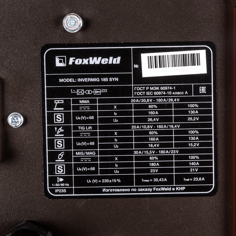 Многофункциональный сварочный полуавтомат FOXWELD INVERMIG 185 SYN с синергетическим режимом управления позволяет производить сварку постоянным током, используя инверторную технологию преобразования и управления сварочным током, что уменьшает габариты и вес по сравнению с традиционными трансформаторными полуавтоматами. С помощью этой модели можно проводить полуавтоматическую сварку (MIG/MAG) сплошной проволокой в среде защитного газа и самозащитной проволокой без использования защитного газа в ручном и синергетическом режимах, ручную дуговую сварку (ММА) на постоянном токе штучным покрытым электродом с рутиловым и основным покрытием и аргонодуговую сварку (ТIG LIFT) на постоянном токе с возбуждением дуги касанием вольфрамового электрода. Регулировка индуктивности позволяет вести процесс сварки с минимальным разбрызгиванием металла и приспосабливать процесс к любому типу работ. На задней панели расположена розетка 36 В для подключения подогревателя газа, который необходим для защиты обледенения редуктора во время продолжительной работы.