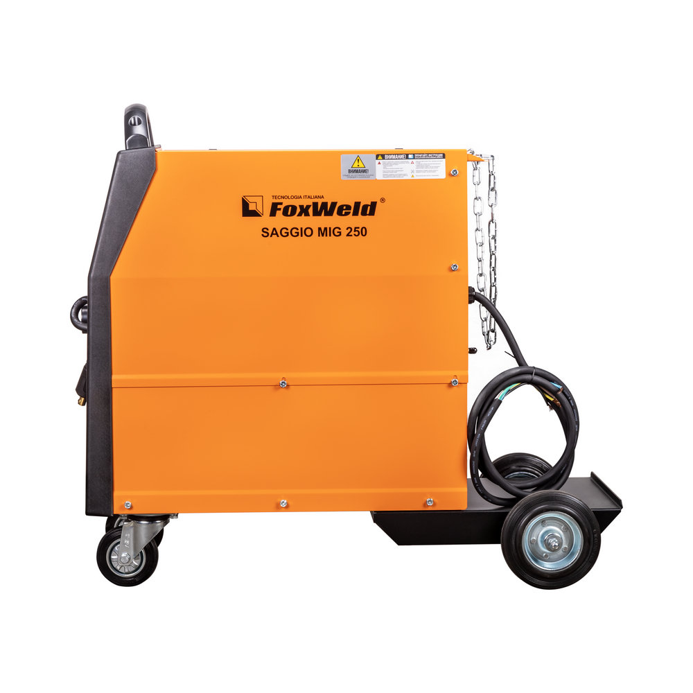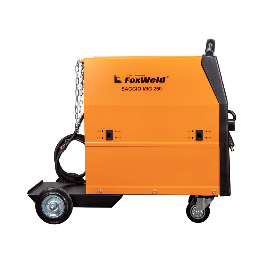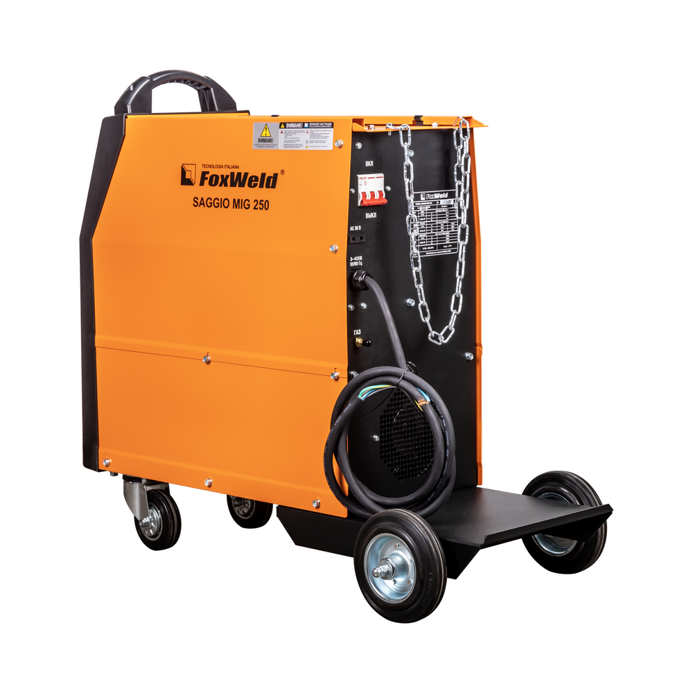 Сварочный полуавтомат FOXWELD SAGGIO MIG 250 — многофункциональный инверторный сварочный аппарат с синергетическим управлением, предназначенный для широкого использования в отраслях по производству различных металлоконструкций, где работают со сплавами стали, алюминия или меди. В источнике питания реализовано три режима сварки: MIG/MAG, TIG LIFT, ММА. Синергетическая система управления трёхфазного аппарата облегчает настройку режимов сварки и позволяет быстро настроить оборудование под любые задачи, не тратя время на дополнительные настройки сварочного процесса. Регулировка индуктивности позволяет формировать форму сварного шва и глубину проварки металла. В памяти автоматики можно создавать и сохранять 10 программ сварочных работ. Есть возможность подключения горелки Spool Gun. В конструкции рамы сварочного аппарата есть площадка для крепления баллона с газом. В пространство для размещения проволоки можно установить катушку диаметром D300. На задней панели расположена розетка 36 В для подключения подогревателя газа, который необходим для защиты обледенения редуктора во время продолжительной работы.