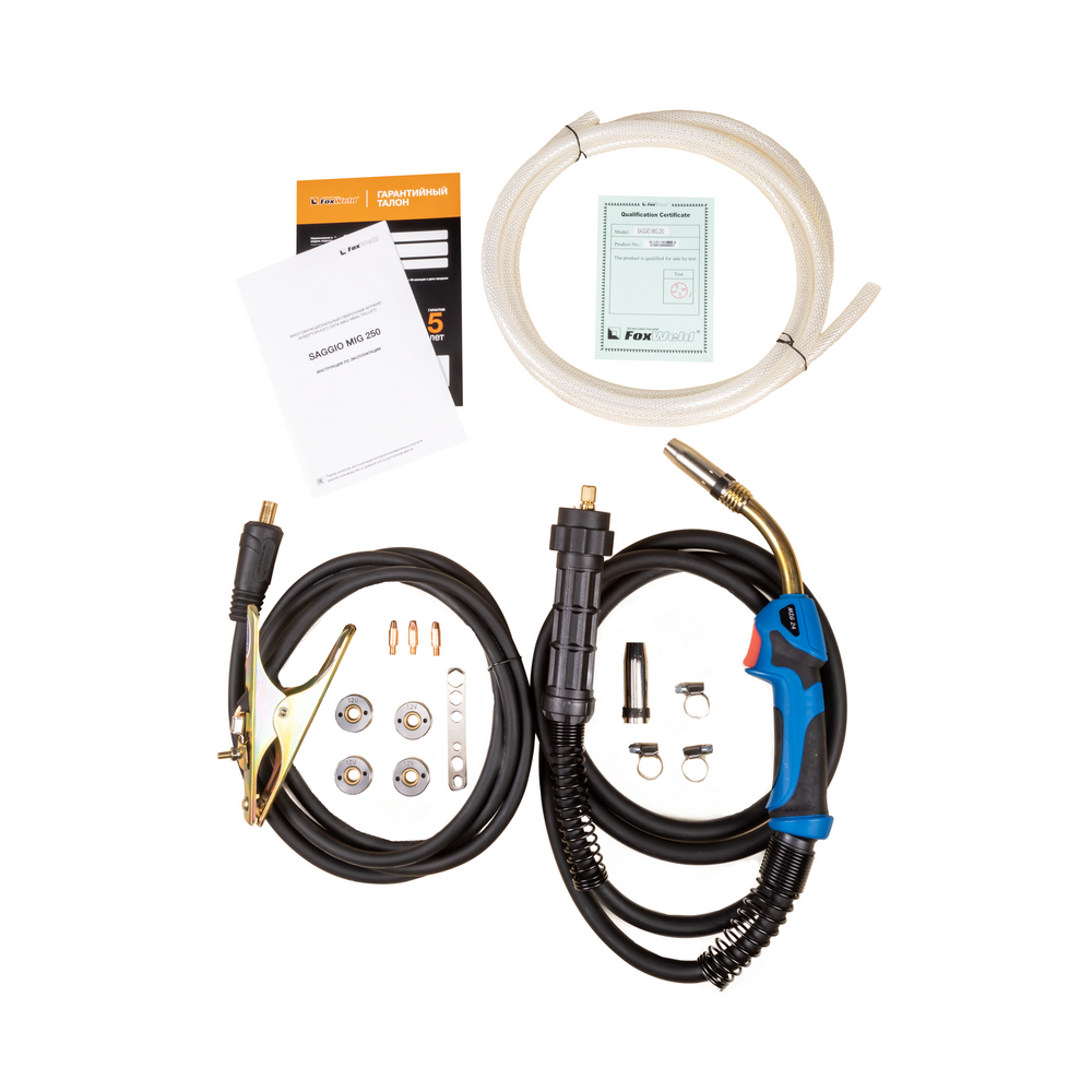 Комплект ЗИП (сопло; наконечники 0,8 / 1,0 / 1,2; ролики 0,8 / 1,0 – 2 шт.; 1,0 / 1,2 – 2 шт., ролики для AL 1,0 / 1,2 – 2 шт.; хомуты – 2 шт.) – 1 компл.;