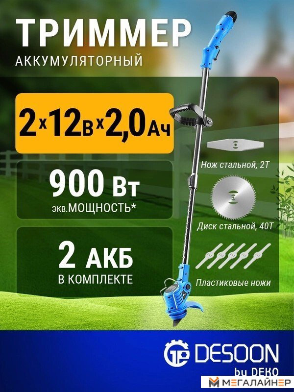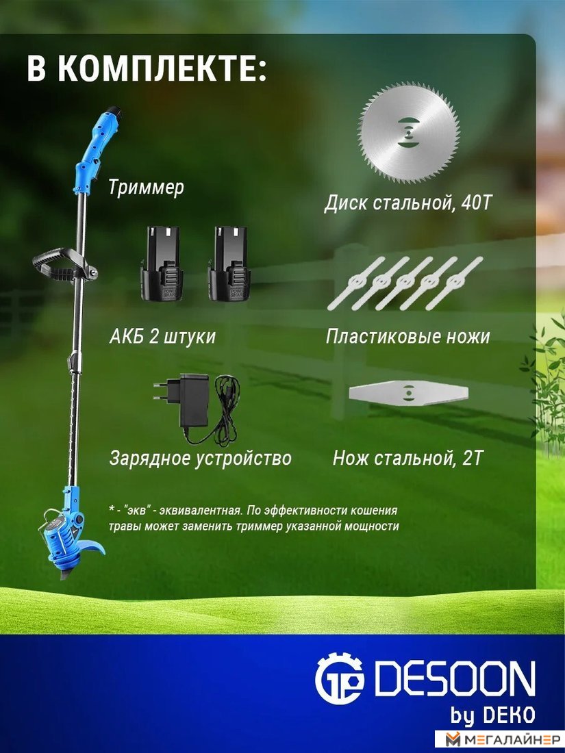 | Комплектация | - Триммер - 1 шт - Защитный кожух - 1 шт - АКБ - 2 шт - Дополнительная рукоятка - 1 шт - Скоба - 1 шт - Зарядное устройство - 1 шт - Режущий диск 40Т - 1 шт - Металлический нож 2Т - 1 шт - Пластиковые ножи - 5 шт - Торцевой ключ - 1 шт - Крепежный комплект - 1 шт - Руководство по эксплуатации - 1 шт |