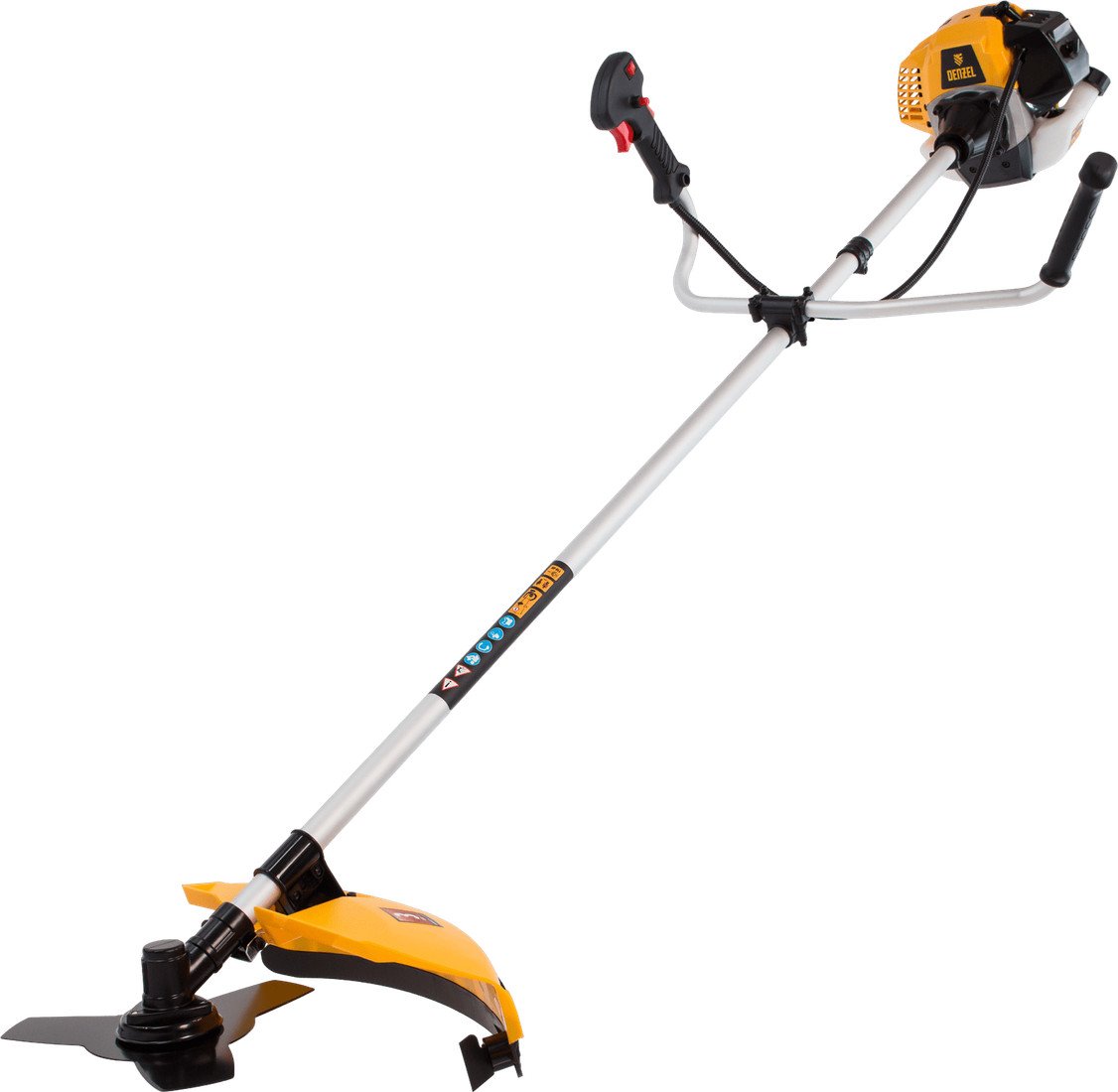 | Информация | - Бензиновый триммер Denzel DR-33 96271 с двигателем объемом 33 см3 и неразъемной штангой состоит из 2 частей. Используется для ухода за газоном, скашивания травы различных типов, в том числе с жесткими стеблями (полыни, крапивы, лебеды). Режущими элементами являются трехлопастный стальной нож и усиленная полиамидная катушка с леской. Оснастка вращается со скоростью 9500 об/мин и обеспечивает ширину скашивания 25,5 см и 42 см. Двухтактный одноцилиндровый двигатель не зависит от электросети, поэтому триммер может использоваться на отдаленных участках. Топливная смесь готовится из бензина и масла, для смешивания которой предусмотрен удобный дозатор. - Преимущества: - Долговечность — покрытие цилиндра пористым хромом увеличивает ресурс, чугунные колодки сцепления отличаются высокой прочностью, двигатель защищен от внешних воздействий ударопрочным корпусом. - Легкий запуск — усиленный стартер и праймер позволяют быстро приступить к работе даже после длительного перерыва. - Оптимизированная антивибрационная система — можно длительное время работать без вреда для здоровья. - Аккуратная и безопасная работа — защитный кожух не дает траве, веткам и камням отскакивать на пользователя. - Надежный редуктор — даже на высоких оборотах двигателя обеспечивается эффективная передача крутящего момента на оснастку без остановок и заклинивания. - Низкое потребление топлива — заправленного бака хватает на 45 минут непрерывной работы, что экономит бюджет и время пользователя. - Полуавтоматическая катушка — режущая леска подается при легком ударе шпули о землю, останавливать двигатель для этого не нужно. - Автоматическое подравнивание лески — ограничительный нож на кожухе отрезает лишний корд, что позволяет предотвратить перегрузку и перегрев двигателя. - Удобное управление — асимметричные велосипедные рукоятки обеспечивают анатомически комфортный захват. - Эффективное распределение нагрузки — одноплечевой ремень снижает усталость и повышает работоспособность пользователя, а защита бедра предотвращает удары штанги о ногу и появление синяков. - Небольшой вес 6,5 кг — триммер легко удерживать и перемещать по рабочей площадке. |